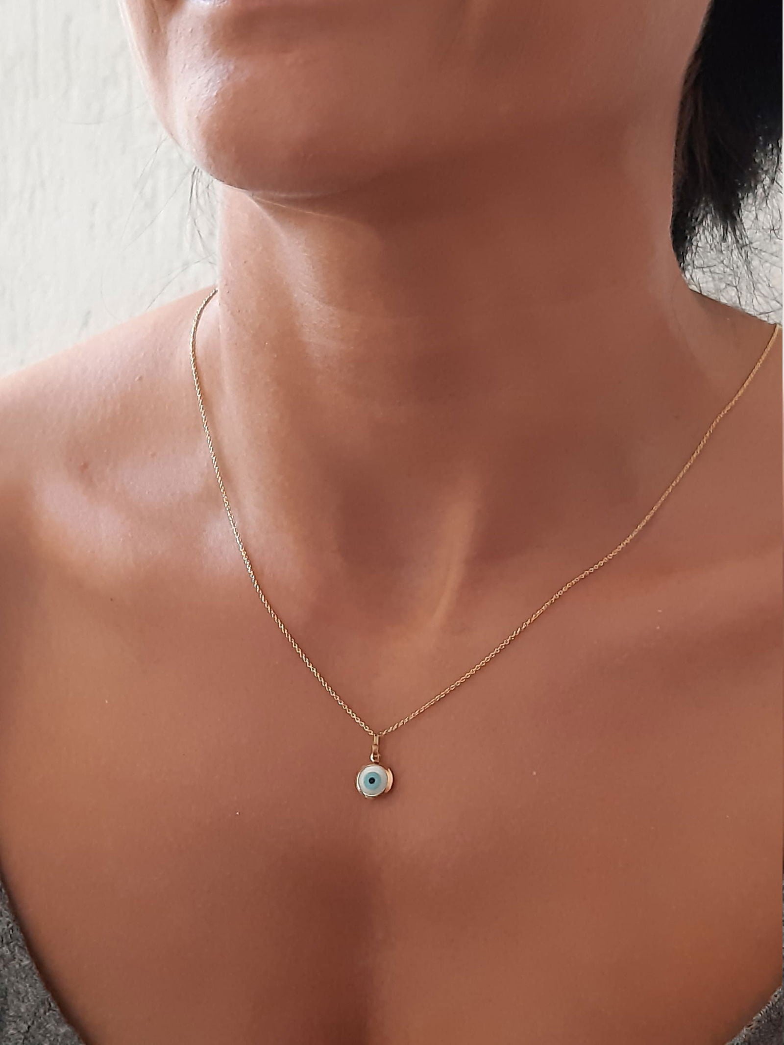 This Elegant solid gold Evil Eye Necklace can be worn alone or together with other Necklaces.